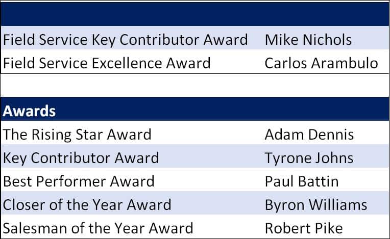 The group also recognized individual excellence awards at an award dinner, chaired by Jean-Christophe Paris, SVP – Americas, and John Jeffery, National Sales Director.