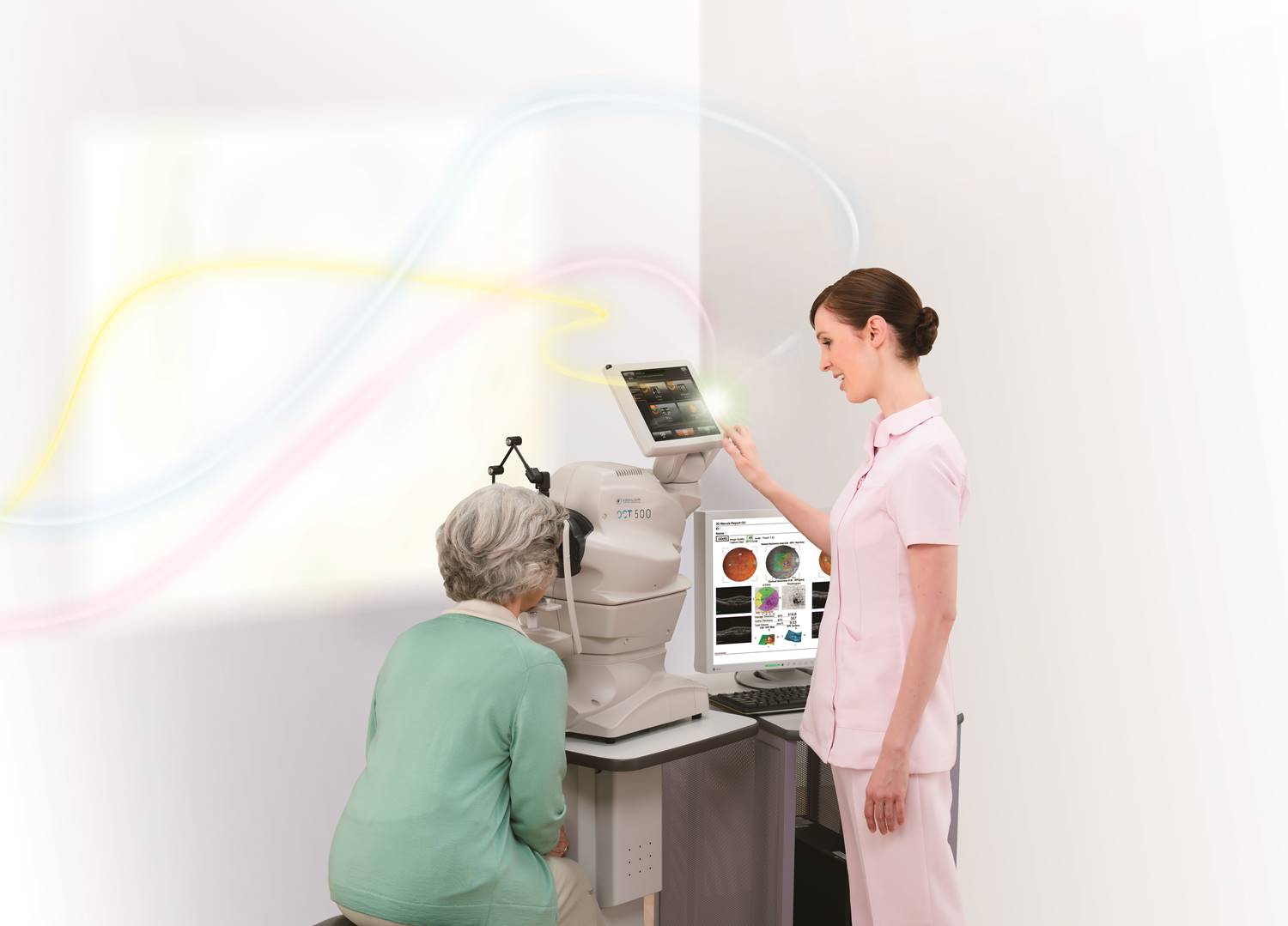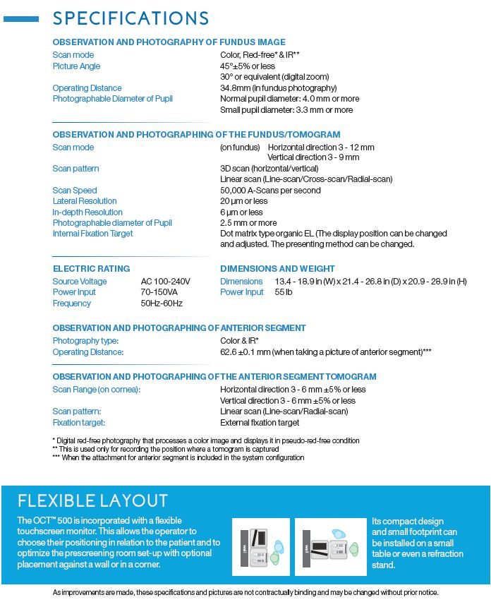 OCT 500 is the most user-friendly OCT on the market due to its fully automated function. With one touch on the screen, eye focus, optimization, and image capture are performed automatically. After capturing, the report can be displayed immediately by clicking on a single icon.