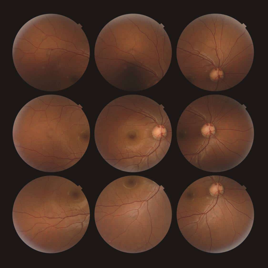 The 9-point fixation target in the 3D OCT-1 allows the operator to make nine different color fundus photos and compose them into one total overview of the fundus. With optional software, a panoramic or mosaic overview can be created.