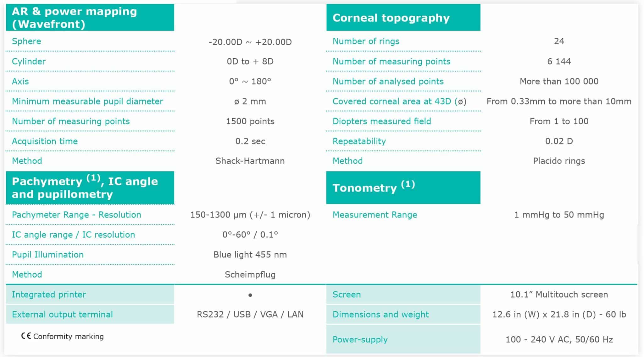 - 7 detailed measurements in 90 seconds for both eyes, including wavefront aberrations, pachymetry, non-contact tonometry, topography, ARK and more