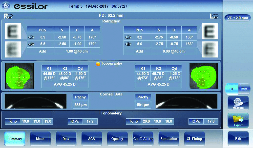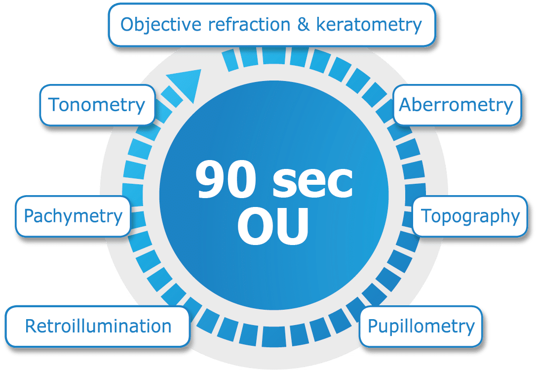 - 7 detailed measurements in 90 seconds for both eyes, including wavefront aberrations, pachymetry, non-contact tonometry, topography, ARK and more