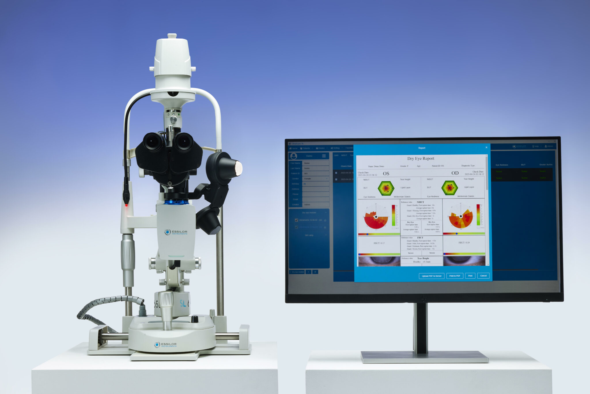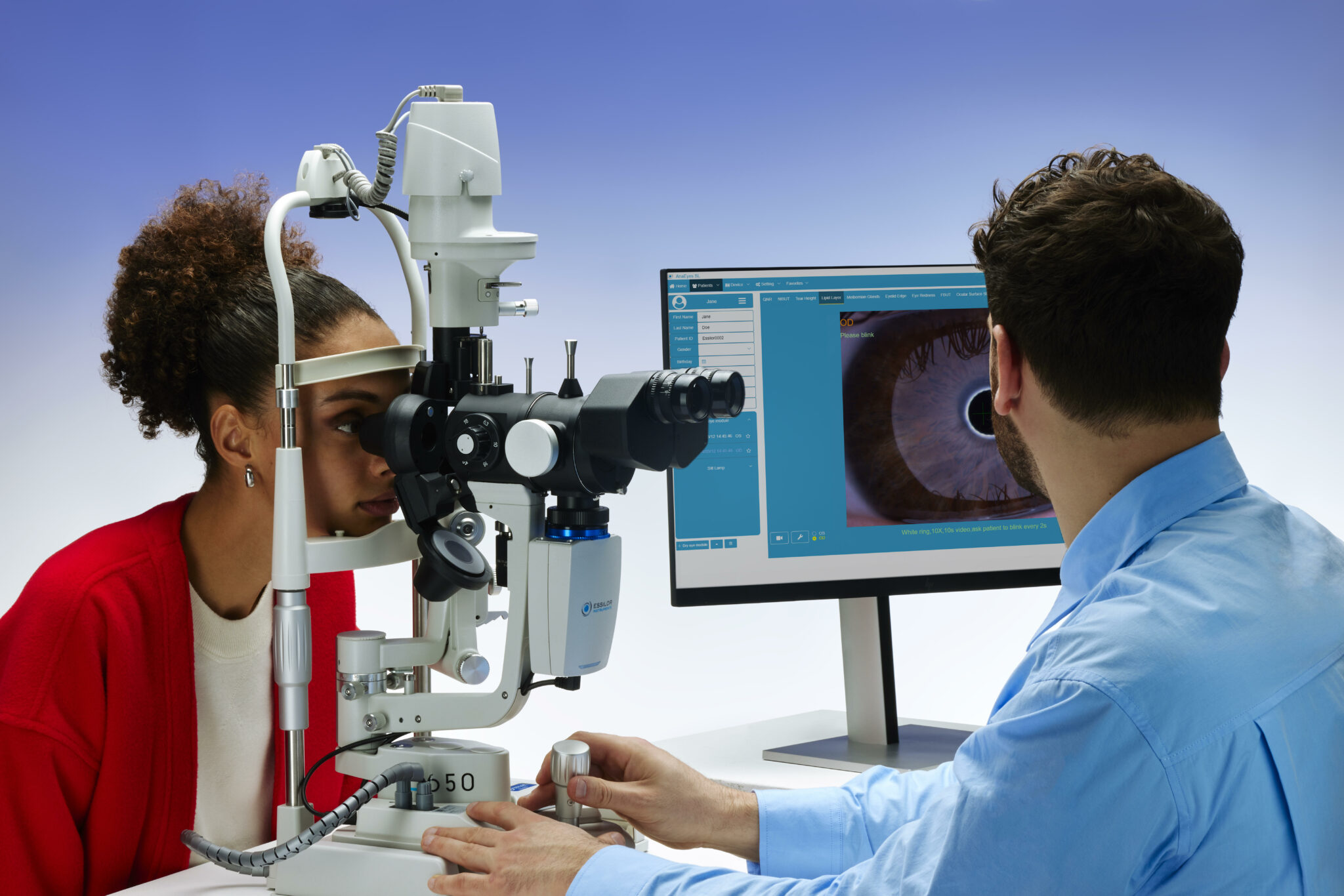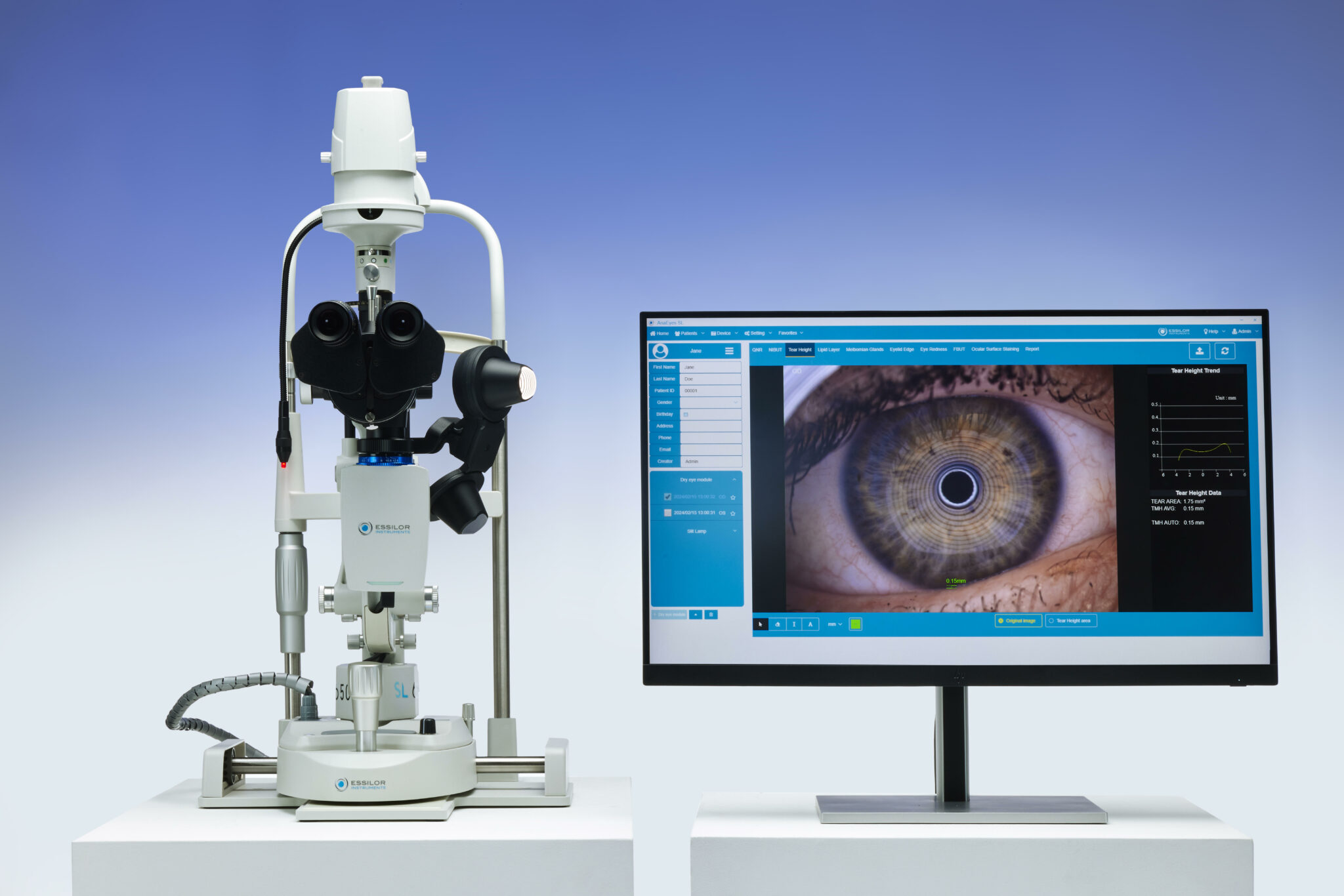 - Five comprehensive and non-invasive tests for a complete dry eye assessment, including: meibography, NIBUT (non-invasive break-up time), eye redness analysis, tear meniscus height, and lipid layer thickness