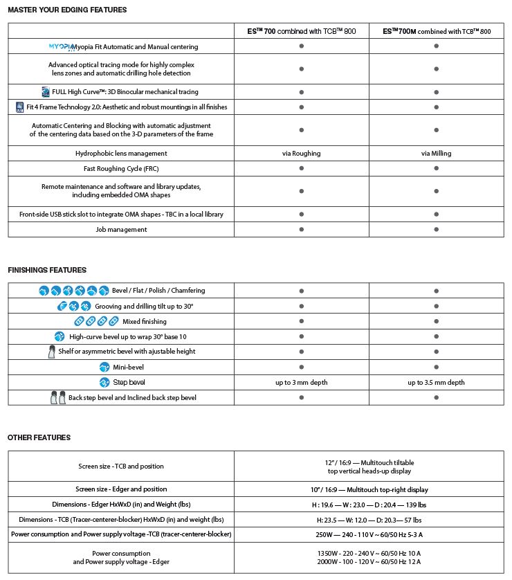 A compact and user-friendly in-office edging system, composed of the ES 700 edger and TCB 800 automatic tracer-centerer-blocker (TCB). It is the perfect solution to reach precision with ease.