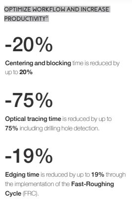 DUAL-EDGING TECHNOLOGY – Secures edging for very slippery hydrophobic or delicate lenses. Minimizes axis deviation risks and cuts all lenses with a perfectly controlled result.