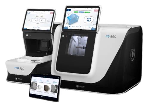 ES 800 is a compact and easy-to-use in-office finishing system, composed of the ES 800 edger and TCB 800 automatic tracer-centerer-blocker (TCB). A hybrid version, ES800M, combining milling and grinding, secures the edging of slippery or delicate lenses and minimizes axis deviation risks.