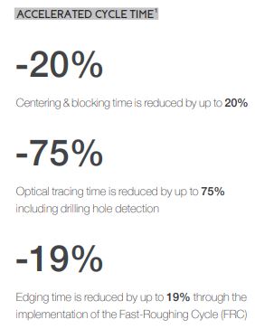 • FULL HIGH-CURVE TECHNOLOGY – Avoid risks of breakage up to base 10 for wrap-around frames with a self-adjusting process incorporating a roughing cycle that automatically adapts to the curves of lenses. Optimize bevel placement and shelf depth for safe mounting without undue lens stress.